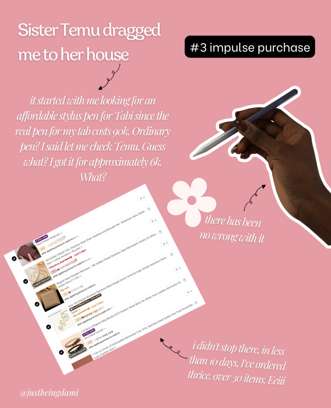 As I write this, I have two separate Temu orders on the way with multiple items in each and my first order from Temu was just a little bit over 10 days ago. So how did they gain my trust so fast? 🫠 If nothing, I'll give it up to whoever strategizes their marketing plans because tell me why Temu swayed me to spend 34k Naira under 4mins because they promised me 10k cash back? 😭 I sharply ordered it without thinking. Laughs in how come?